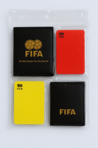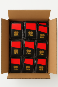 طراحی استاندارد با کیف چرمی مشکی و کارت‌های قرمز و زرد داخل بسته‌بندی رسمی
